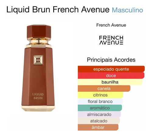 O Liquid Brun da French Avenue é um perfume Masculino Amadeirado Especiado (ou Gourmand), apresentado em frasco de 100ml.