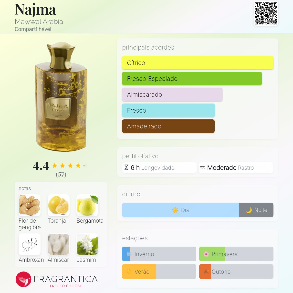 O Najma da Mawwal Arabia é o perfume da linha focado em luxo frutado e sensualidade. Ele segue a trilha olfativa de fragrâncias como o Erba Pura, sendo um perfume vibrante, expansivo e muito alegre.