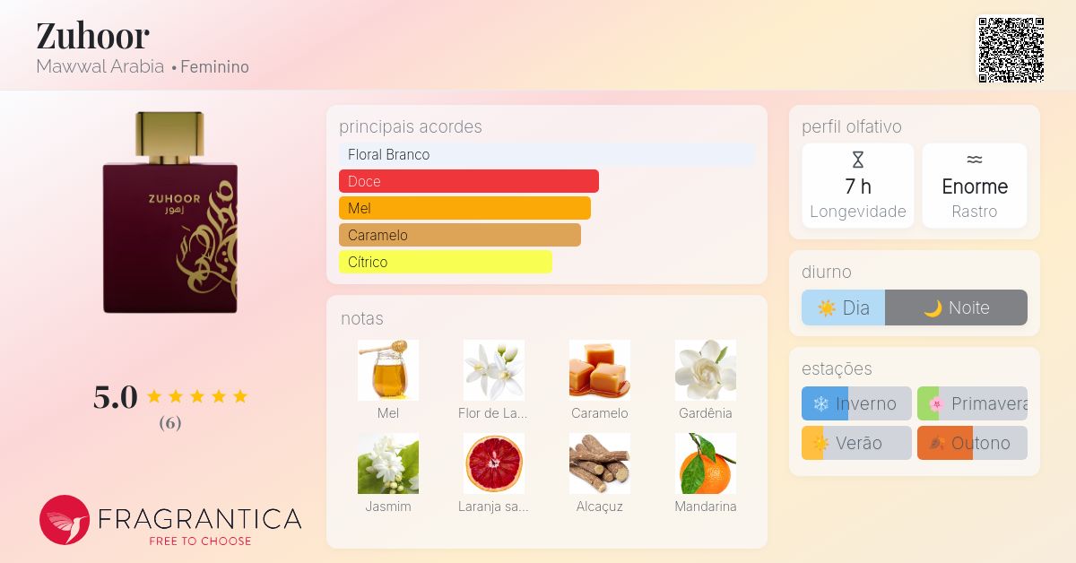 O Zuhoor é o perfume mais "luminoso" da Mawwal. Se o Mashaer é romântico e atalcado, o Zuhoor é vibrante e floral. É para quem quer cheirar a flores frescas e radiantes o dia todo.